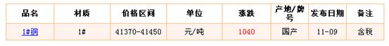 11月9日長江有色網(wǎng)銅價格市場行情: 1#銅價格41370-41450元/噸,對比前一交易日價格漲1040元