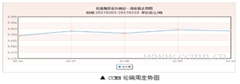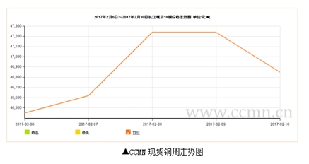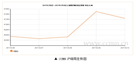 長江有色金屬網走勢圖顯示,本周滬銅整體小幅走高,當前月1702合約周均結算價報于46916元/噸,日均上漲156元/噸。周線上漲1.57%。